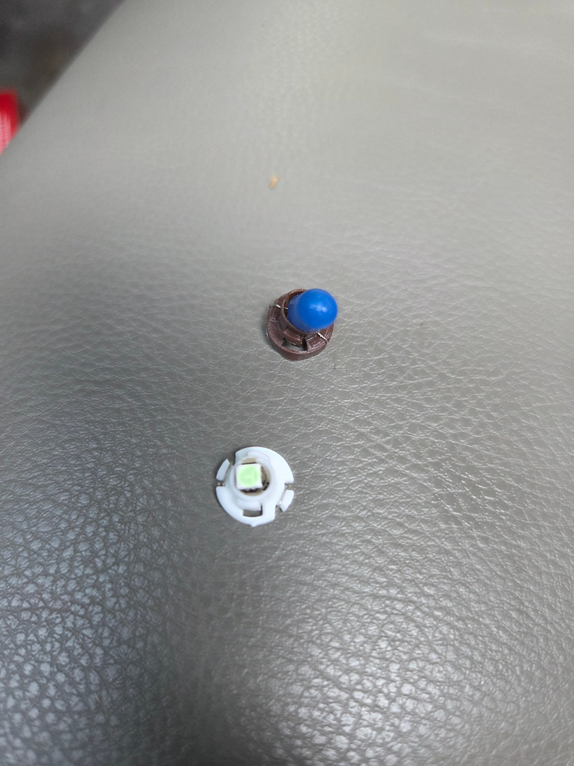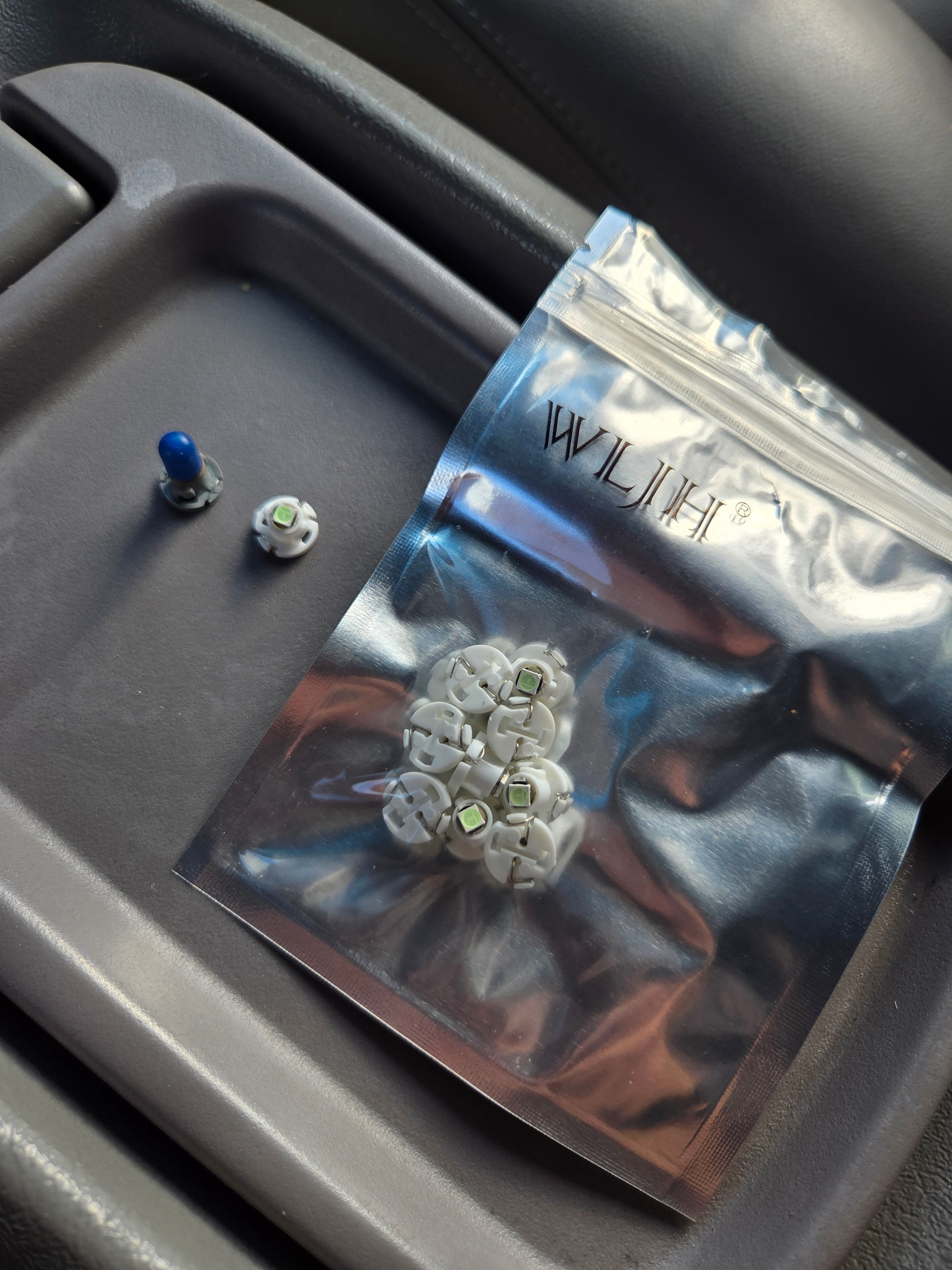 Here is a shot of the old HVAC bulb in comparison to the new bulbs. The bulbs are T4.2’s for the HVAC controls and I went with the Ice Blues. Link to the bulbs here.